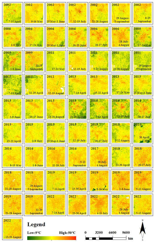 Spatial distribution of the summer averaged 30 m predicted LST using the proposed method from 2002 to 2022.
