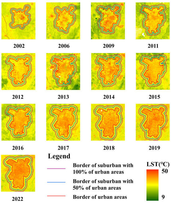 Both averaged summer LSTs from 2002 to 2022 were computed (Figure 11). As shown in Figure 11, due to the rapid urbanization, the spatial distribution of the LSTs showed an irregular distribution, and the high LST areas changed from urban to suburban areas. The high LST areas were mainly concentrated in the urban high-density blocks, where buildings and population were highly concentrated. The low LST areas were mainly concentrated in the mountainous areas of the suburban, such as the Longquan Mountain Range in the southeast of the study area. The spatial resolution characteristics of the LSTs from 2002 to 2022 were similar, such as the high LST areas covered by the built-up areas. The low LST areas were mainly distributed in the vegetation-covered areas, such as farmland and mountain areas outside the built-up areas. We can see that the increase in the SUHI effect was roughly in the “southeast-northwest” direction as the urban built-up area expanded. The expansion of the SUHI effect corresponds to the urban spatial growth pattern.