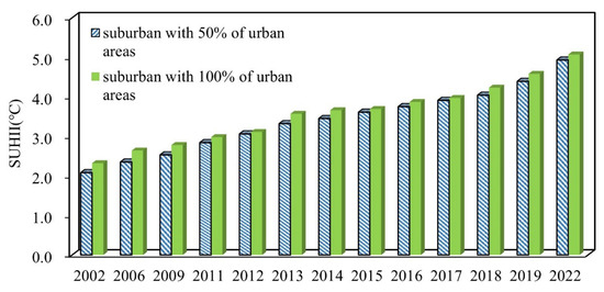 Temporal changes of SUHII in the study area from 2002 to 2022.