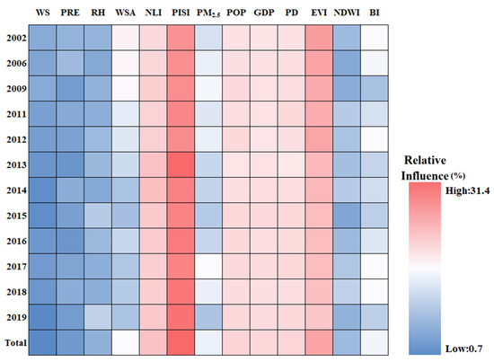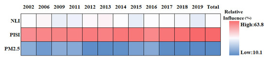 The relative influence of SUHI of the driving factors in Chengdu City from 2002 to 2019.