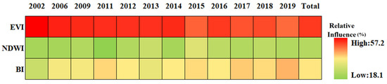 The relative influence of SUHI of the natural land surfaces driving factors in Chengdu City from 2002 to 2019.