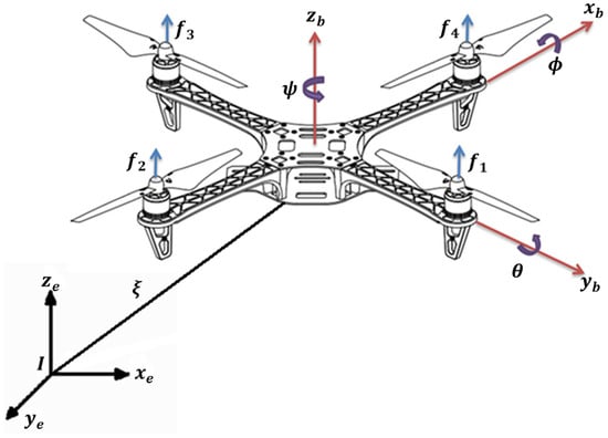 Quadrotors are under actuated systems with four control inputs and six degrees of freedom, which evolve in three-dimensional space. Their dynamical model makes them a system of interest to the scientific community because they contain under-actuated, strongly coupled, and multi-variable nonlinear dynamics. The aerial vehicle is considered as a rigid body that evolves in three dimensions, subject to a main force u generated by the propulsion of the rotors. The dynamical model of the drone is obtained from the Euler–Lagrange approach. Figure 2 shows a free-body diagram of the quadrotor aircraft.