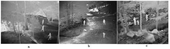 In [], the authors used a thermal camera using a deep learning model for human detection in low-visibility fire smoke scenarios. Furthermore, Reference [] presented a new dataset of thermal image sequences for person detection and tracking. Besides, the authors proposed a new framework based on particle filters to track persons in aerial thermal images, using a small computer.