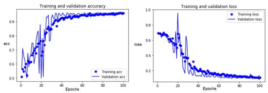 The CNNarchitecture had a sequence of consecutive layers, and this is important to increase the capacity of the network, as well as reduce the size of the feature maps so that they are not too large when we reach the Flatten layer, which will convert them into a one-dimensional vector of values. The procedure starts with input images of size [150 × 150], ends with feature maps of size 2 × 2, followed by a conversion of the 2D array of [2 × 2] to a 1D vector using the Flatten layer. The depth of the feature maps increases progressively in the network (from 64 to 128). This is a pattern that can be observed in all CNNs: it starts with a set dimension image and becomes progressively smaller in order to highlight the most-representative features of the dataset.