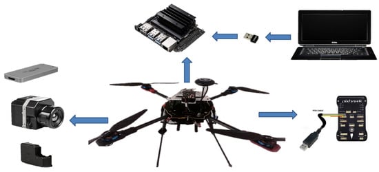 This allowed us to evaluate the CNN model in real-time on board a prototype quadcopter vehicle. In order to test the CNN deep learning model for the detection of persons in thermal images from an aerial perspective and reduce the computational processing requirements, the developed CNN model will only evaluate the selector boxes generated by the Haar model and assign a label for each of the frames. The selector box may represent a person or may represent part of the woodland environment. This implementation will allow the processing to be carried out on board the prototype vehicle. The prototype vehicle used for the CNN model test is shown in Figure 14.