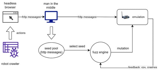 The state-of-the-art fuzzing architecture for embedded web interface [19,20,46] is shown in Figure 2. A middle man is set up between the headless browser and the server. The man in the middle can be implemented by using network proxy tools like w13scan or mitmproxy. The headless browser requests web pages from the server, while a robot crawler is responsible for crawling and manipulating the web pages to trigger network traffic. Meanwhile, the man in the middle collects the network messages as initial fuzzing seeds. After initial fuzzing seeds are collected, a fuzzing engine mutates the seeds to generate malformed messages (test cases) and sends them to the DUT. Meanwhile, it monitors the crashes to report Buffer Overflow (BO) vulnerabilities and gathers coverage information as feedback to direct the next round of mutations. CI vulnerability is detected by injecting certain command strings, e.g., touch filename, and checking if the command is executed, e.g., the specified file is created. The XSS vulnerability is detected similarly by examining logs to check whether the injected JavaScript codes are executed.