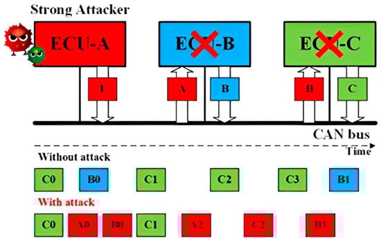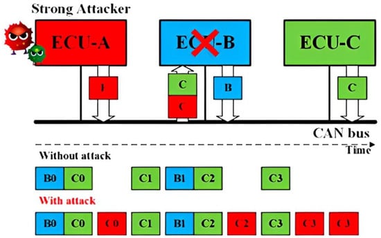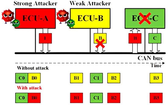 - The priority-based arbitration, which allows frames with higher priority to dominate the communication channel, poses a significant security risk, as it enables an aggressive Electronic Control Unit (ECU) to manipulate the communication channel, potentially disrupting the entire network’s functioning [88,89,90].