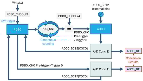 The objective here is to identify a sampling technique that is capable of optimizing the performance of the ADC integrated into the S32K144 board, which serves as the Traffic Analyzer. The goal is to achieve the highest possible number of voltage samples at a 12-bit resolution. This is accomplished by utilizing the Hardware Trigger mechanism in conjunction with the PDB timer module, as illustrated in Figure 4.