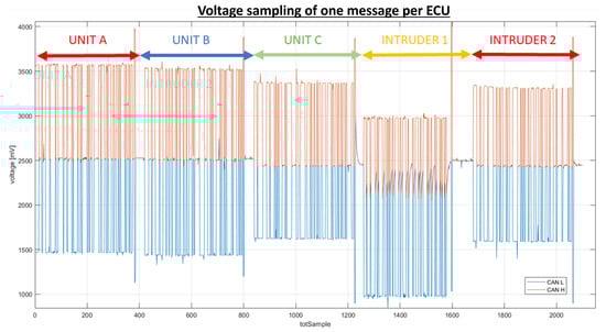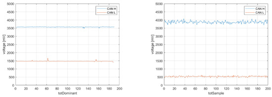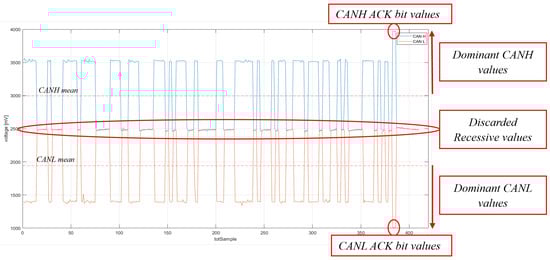 The voltage features represent the measurable characteristics of the phenomenon under observation. Only dominant values are taken into consideration for feature calculation because they correspond to the moments when the units transmit voltage values. Values associated with the ACK bit are excluded from consideration as they signify the instances where each of the ECUs acknowledges the receipt of the message. To illustrate this, consider the sampling of a CAN signal from a message transmitted on the bus, as depicted in Figure 5. In this context, dominant values are graphically identified as those lying above the average voltage of CANH and below the average voltage of CANL.