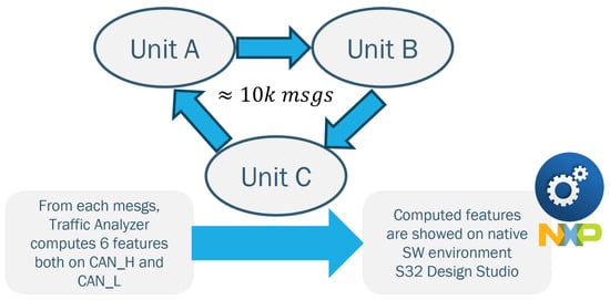 In this section, our goal is to establish continuous communication among the three units (ECUs). Meanwhile, the Traffic Analyzer will print feature values that are associated with the sender for each message. We anticipate sending approximately 1000 messages on the bus using the communication method illustrated in Figure 6.