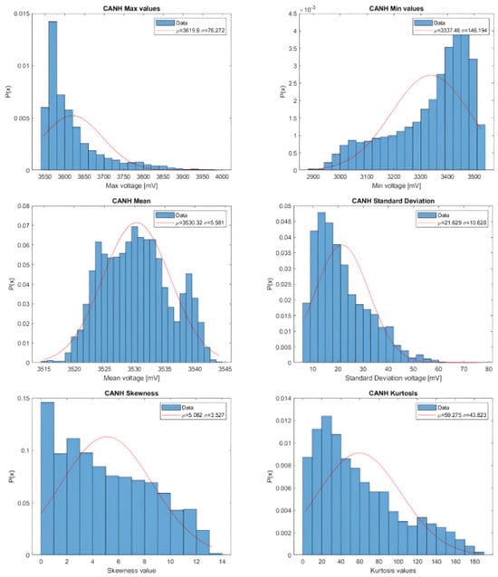 After collecting the data, we proceed to analyze the data trends for the three units. We compare the Probability Density Functions (PDFs) estimated from the features obtained from both CANH and CANL to a Normal distribution. The Normal distribution is characterized by a mean that is equal to the mean of the analyzed feature, and a standard deviation that is equal to the standard deviation of the analyzed feature. An example of the data trend for Unit A CANH is illustrated in Figure 7.