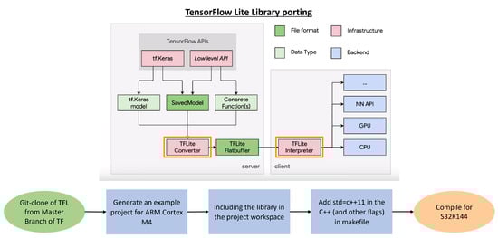 It has been determined that the most suitable approach to implementing a neural network involves use of the TensorFlow [123] and Keras [124] environments. This choice offers the advantage of allowing for the use of the TensorFlow Lite format, which in turn allows us to exploit the capabilities of the hardware while reducing the size of the network in terms of storage space, measured in Kbytes. The characteristics of the chosen neural network model are described below: