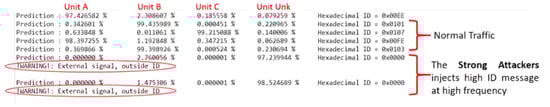 - ECU Fingerprinting through Parametric Signal Modeling and Artificial Neural Networks: This algorithm uses parametric signal modeling and Artificial Neural Networks to identify the physical fingerprints of ECUs. The algorithm extracts the features of the CAN packets and uses them to train the Artificial Neural Network. The trained network is then used to classify the ECUs and to detect any abnormal behavior [65,66,67,68,69,70].