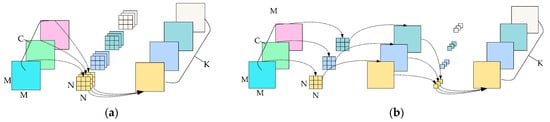 Comparison of general convolution and depthwise separable convolution. The proportion of the computation of depthwise separable convolution to that of general convolution is calculated as follows, given an input size of M × M × C, a convolutional kernel size of N × N, and an output channel size of K: . In general, N = 3 and K > 1, so that depthwise separable convolution requires relatively little computation. (a) Standard convolution; (b) depthwise separable convolution.