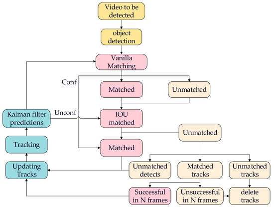 The entire algorithm framework is illustrated in Figure 1. Firstly, the video to be detected is passed through the object detection module for target detection. We use YOLOv5n-LC as the detector, which outputs information about the detected target boxes. Next, the feature extraction network is constructed using the full-scale network (OSNet) within the tracking module to extract the appearance features of the targets. Simultaneously, the NSA Kalman method within the tracking module is employed to update and predict the position information of the targets. Finally, through vanilla and IOU matching methods, the results from the object detector are associated with the predictions from the tracking module. Based on the vanilla matching results, if the vanilla is successful, the next frame can be updated and predicted directly. In cases where the matched target disappears but reappears in N frames, the tracking can be confirmed and the next frame can be predicted. In the case of a new target appearing without a tracking frame, the IOU matching can be used. If three consecutive matches are successful, it will be considered a confirmed state. The algorithmic framework is shown in Figure 5.