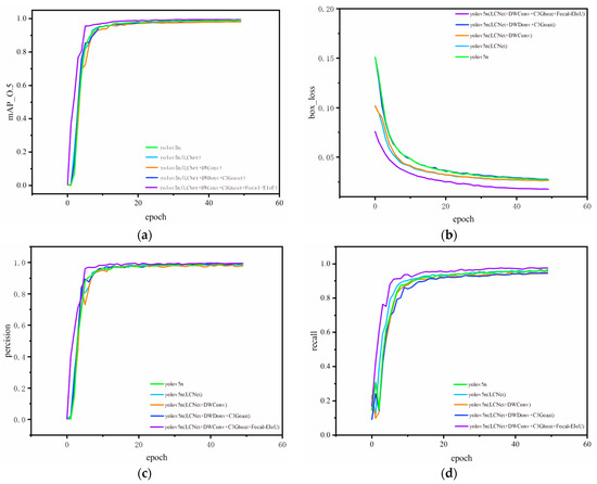 YOLOv5n-LC was added to the ablation experiments of different modules, respectively, and the results of 50 rounds of training on the NEF dataset are compared. (a) mAP0.5 curve comparison; (b) loss curve comparison; (c) precision curve comparison; (d) recall curve comparison.