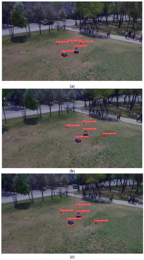 We created our own target detection and target tracking datasets. For the detection part, we collected data using two different UAVs, called the NEF dataset. We collected data in two different scenarios: an open grassy area without obstacles and a forested area with obstacles, such as trees. In addition, for the ground robots, we used different sizes of robots for different scales. We used a DJI PHANTOM 3 STANDARD at 5 m and 15 m, two different heights, to record situations such as overlapping in the motion of dynamic multi-targets on the ground in the stationary state of the UAV, as well as the shooting of dynamic multi-targets on the ground by the UAV at a constant speed of 2 m/s, and the occurrence of camera shake when the UAV suddenly stops, respectively. In total, four video clips were collected, from which 2390 frames were extracted. The image size is 1920 × 1280 pixels. The dataset is divided into training and validation sets in the ratio of 80:20, with the training set containing 1904 frames and the validation set containing 332 frames.