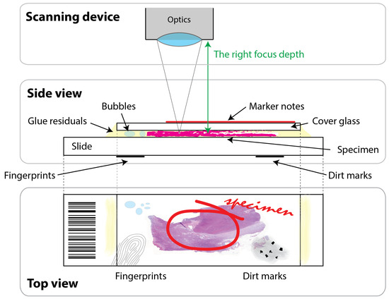 The figure illustrates that many artifacts may ruin finding the right focus depth in whole slide imaging. The top two blocks show the relative position of the scanning device’s optics and the histology slide with its different layers, i.e., glass slide; specimen; cover glass; covering glue; possible air bubbles in the glue; and dirt, fingerprint, and marker artifacts on the glass surfaces. The bottom block shows the top view of the histology slide. The illustration is not to scale.