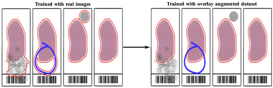 Figure 9 shows the segmentation results before and after overlay augmentation. The segmentation results are significantly better in the areas where there is an artifact pattern that was included in the training set during overlay augmentation.