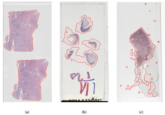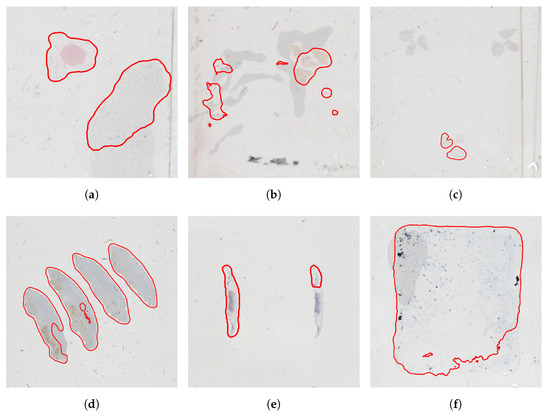 There are cases when overlay augmentation cannot help the result of the segmentation either. Figure 10 shows some such cases. In sub-figure (a), compared to the area of the sample (upper-left part), the size of the bubble is too large and it looks similar to the sample; in this case the augmentation could only partially help. In sub-figures (b–d) the tissue sample was omitted; as the tissues look very similar to the bubble, the algorithm incorrectly cut out parts of the tissue sample. Sub-figure (e) shows a needle biopsy sample where the tissue sample resembles a felt-tip marker and the algorithm incorrectly detected it as a felt-tip marker. The right-bottom part of sub-figure (f) was mistakenly identified as dirt and cut off from the sample area. In the cases of these samples, an improvement could probably be achieved by further increasing the number of training and overlay augmentation samples.