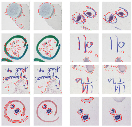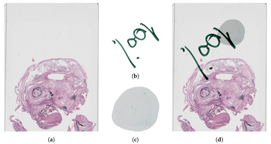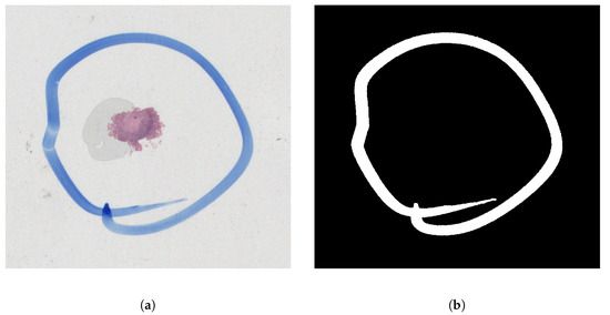 The augmentation process begins with the collection and manual labeling of artifacts in slide images using an image editing software, Krita (https://krita.org/, accessed 9 January 2023). The labeling is similar to the annotation of preview images using multilayer TIF files mentioned above. The new mask image has the same size as the original image and the region of interest (ROI) is marked in white while the background is in black (see Figure 5).