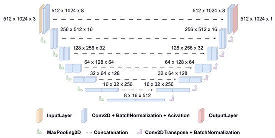 The U-Net architecture consists of a contracting path of 7 layers that captures contextual information and a symmetric expansive path of another 7 layers that recovers spatial details. The layers are interconnected with 2D max-pooling in the contracting branch, and we applied 2D convolutional transpose with batch normalization between the layers on the expanding branch.