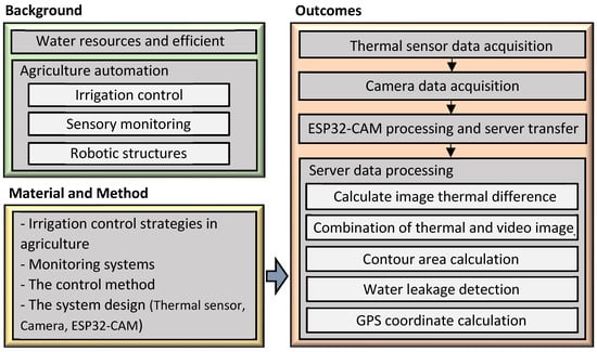 In the introduction, we mentioned an effective agricultural irrigation system and method for minimizing the water leakage, especially to be used in smart agriculture robotics. In the next section, general information will be given on agricultural irrigation control strategies, monitoring systems, control methods, and the proposed system design. The system design covers thermal sensors, a camera, and an ESP32-CAM Wi-Fi Bluetooth Development Board. In section three, the results of the study will be given. The results include image data transfer from the camera and thermal sensor, data processing by the server, and water area detection. In the final section, the conclusions and discussion will be given. The layout of the study is given in Figure 4.