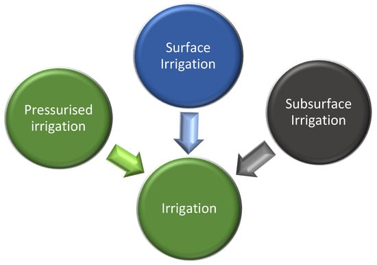 Although excessive irrigation can damage the plant, there is basically no unknown situation in the field. In short, since irrigation is not adequately controlled, it is unnecessary to prevent it or to check whether there is excess water by travelling to various points of the land. In man-made systems, irrigation is carried out by considering the plant’s need for water. Here, water can be provided directly to the plant, or it can be provided in very close proximity to the plant in a way that it can reach the roots of the plant. The application depends a little bit on the possibilities available on the land. Accordingly, agricultural irrigation is realized using three different methods. While some of these methods are controlled by modern systems, some of them are not controlled much due to the advantages of land conditions. It is possible to see these in Figure 5 [40,41].