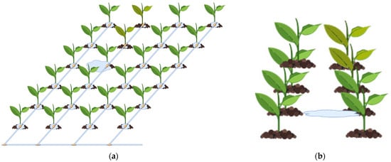 Surface irrigation systems are systems where irrigation is performed by utilizing the conditions of the land. Here, water moves along a natural slope and flows into canals. Water is provided to the plant by ponding on the land. This method, called “basin” or “flood” irrigation, which is widely used in classical agriculture, is a method that can cause the excessive expenditure of water and evaporation. In this method, water saving is not often pursued [42]. Water is released to the land, and it is assumed that the soil receives the water it can take. Excess water is either lost by evaporation or it finds its way into the soil and disappears before reaching the plant. According to the studies on farmer preference, the producer mostly prefers this method because of the product need, because it is easy, or out of necessity [43]. In subsurface irrigation, water is provided to the roots by the effect of capillary forces (capillarity) under the soil. It has been determined that this method provides significant benefits to plant development, and while there is a great decrease in the amount of water used, it causes extra investments, and different problems may occur due to unused elements in the water [44,45]. Another method is pressurized irrigation. Here, water is delivered to the plant by increasing the pressure to a certain value. The pressure is created by mechanical systems or by delivering water to the plants from a point potentially higher than the irrigation point. Water is usually delivered to the plants either as drip irrigation or with the help of springs according to the type of product. In this system, water is used more efficiently than in the basin irrigation system. When considering irrigation efficiency, it is not advisable to accumulate excessive water at a single point or to interrupt the planned watering process, which ensures that the plants receive an adequate amount of water during irrigation. Doing so may lead to plants being left without water. As in Figure 3, we can try to avoid this problem by controlling irrigation using the methods described by Bwambale et al. [35].