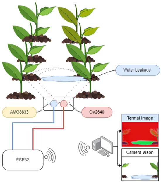 In the designed system (Figure 8), the data from the camera and thermal sensor were collected in the ESP32-CAM and transferred to the server computer via Wi-Fi and processed there. The developed server software was able to detect water leakage that occurred during irrigation by analyzing camera data. Thus, the use of thermal cameras instead of traditional humidity sensors was successfully implemented in detecting water leaks. The transfer of the images to the server, processing on the server, and the results of the experimental study will be presented below.