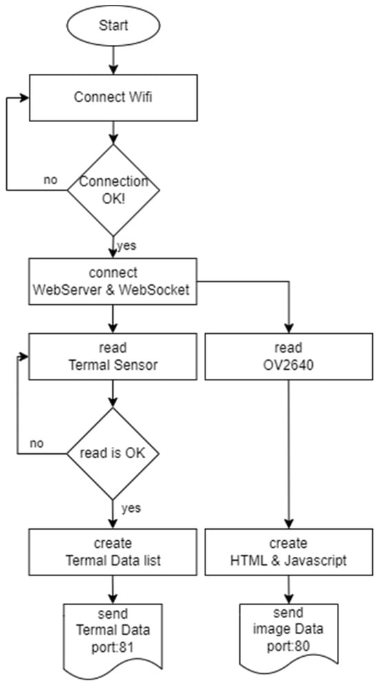 Video images and thermal data can also be sent from the same port, but the two-channel transfer method was used because distinguishing these two types of data and analyzing them on different devices was necessary. The video image from the camera was sent in 320 × 240-pixel resolution. This information and all the setting parameters of the OV2640 can be adjusted by changing the parameters on the server PC if required. The thermal sensor data comprised a total of 256 bytes of data, but the first 128 bytes contained data not needed for the image operation, such as interrupts, thermistor output values, etc. The remaining 128 bytes contained the necessary thermal image data, and after the data acquisition of these 128 bytes by ESP32-CAM, the server transferring was initiated. These operations were implemented using the algorithm shown in Figure 9.