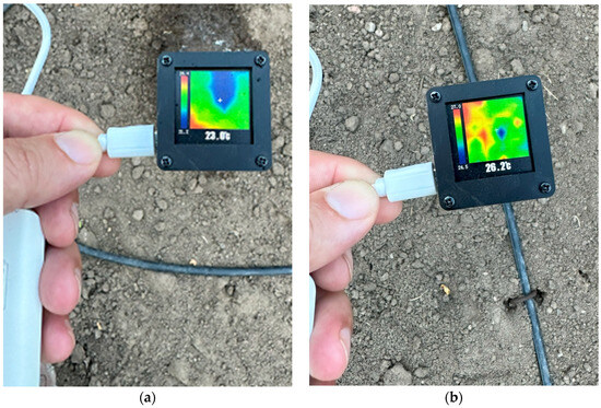 Field control of test irrigation points (The colors represent heat level, blue: cold, red: hot). (a) Water leakage point. (b) Normal irrigation point.