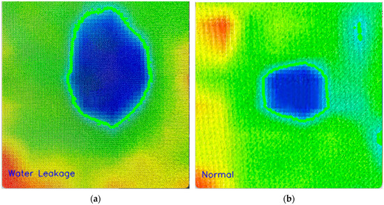 Test points thermal image (The colors represent heat level, blue: cold, red: hot). (a) Water leakage point. (b) Normal watering point.