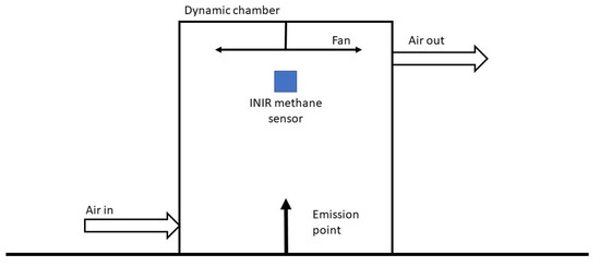 One point of note is that the rate of change of the CH4 inside the chamber can be used to calculate the emission, as is carried out using a static chamber approach [26]. The average emission calculated from the linear increase in the methane concentration inside the chamber of 0.023 g m−3 CH4 s−1, the diameter of the chamber of 0.25 cm, and the height of chamber of 0.40 m would be 1.64 g CH4 h−1 with an overestimate of +64% (range +51% to +79%). Additionally, a chamber of 0.12 m3 placed over an emission at a rate of 1 g CH4 h−1 would become explosive after 23 min.