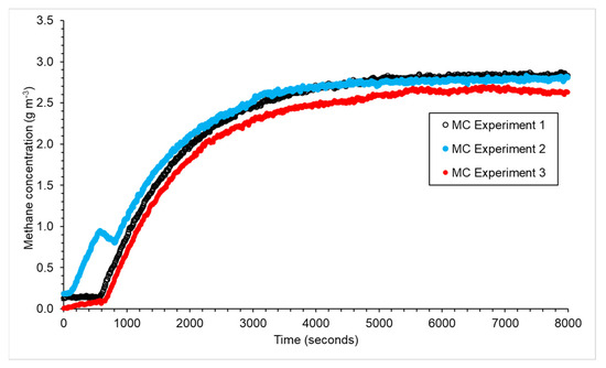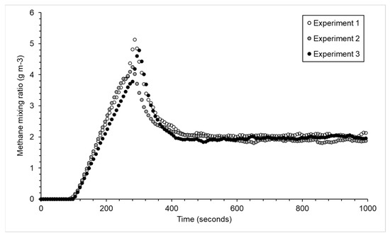 Once the chamber was placed over the emission point, the concentration inside the chamber increased from 0.023 g m−3 CH4 s−1 (~35 ppmv CH4 s−1) to around 4.5 g m−3 (~7000 ppmv). The pump was turned on after 3 min, and the concentration became relatively constant after another 3 min (Figure 2). The Xss inside the chamber for the three experiments with a flow rate of 8.5 L min−1 was 1.99 ± 0.1 g m−3, which corresponds to an average emission rate of 1.01 ± 0.06 g CH4 h−1 (Table 1).