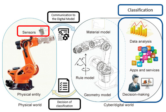 Digitization requires a sensory detection system to create coherence between the physical entity and the cyber world. This requirement, also known as a “data-driven approach”, allows control of the production line and to assure an ongoing production cycle. Permulla et al. studied the DEEP-Cyberia program [11]. They found that data collection and performance analysis are key factors in building the connection of physical and virtual.