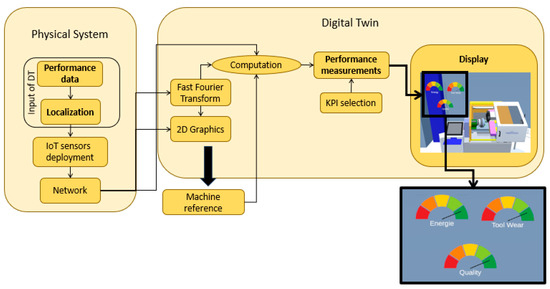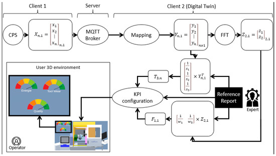 Finally, our approach uses the T and F vectors to visualize the behavior of a normal system user, refer to the blocks “KPI selection” and “Performance blocks” in Figure 3. The selection specifies the type of KPI, it can be a numerical display, a light bulb, a real-time graph, a gauge, etc. Depending on the selection, the design is done in the DT environment and the vectors are either displayed with respect to KPI sections or averaged for an ON/OFF display type. This methodology and its dataflow pipeline are responding to the needs outlined in Section 2.