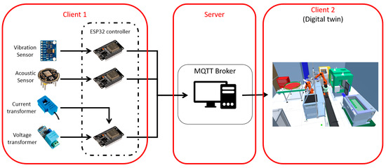 First, the transfer protocol is defined. D’Ortona et al. used the Message Queue Telemetry Transport (MQTT) protocol to send data around the framework of smart cities [17]. They tested the protocol on a small scale and deduced that through a wireless connection, the MQTT protocol performed at the remarkable delay of 58 milliseconds, putting in the forefront of the 4G technology. As a result, we thought that MQTT is beneficial for our approach, where the broker runs as a service on a desktop, for example, the desktop of DT. In addition, Figure 4 presents two clients: client 1 is the IoT sensor, installed on the physical system as described previously, and client 2 is the DT, receiving all these data for performance measurement.
