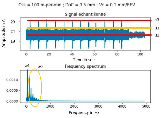 The input vector is then transformed using Equation (1). However, it is important to find the calibration parameters defined as “” and “”. These values are obtained using an oscilloscope to measure the maximum current, corresponding to the maximum output of ADC, defined as 4095 for a 16-bit converter. Thus, after testing the sensor on different current sources, we obtained that and , known that the minimum value for the sensor corresponds when the machine is ON and is not machining. The mapped vector is