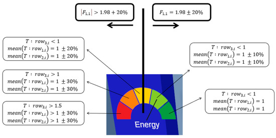 The bold vertical line represents the boundary between the frequency properties. If is in good condition, then the arrow falls to the right side; otherwise, it falls to the left side. In addition, the F-vector presents a higher importance than the T-matrix, meaning that even if T fulfills good conditions, refer to the green level in Figure 8, the arrow still points to the left side in the gauge. However, this case is impossible according to the electrical team of our institute.