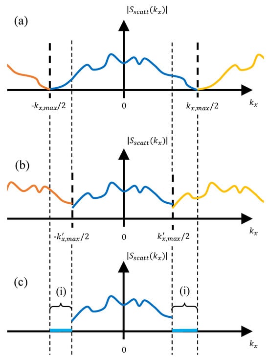 Representation of the PWS of the scattered field (dark blue line: original PWS, orange and yellow lines: PWS replicas). (a) Acquisition domain sampling rate: . (b) Acquisition domain sampling rate: . (c) Zero padding of the part of the spectrum denoted by (i) to achieve the same spatial resolution as in Figure 1a.