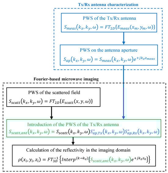 The modification of the Fourier-based imaging algorithm outlined in Section 2.1 to introduce the field radiated by the Tx/Rx antennas is described in Figure 2. For the sake of simplicity, a monostatic imaging system with the same Tx and Rx antenna will be considered.
