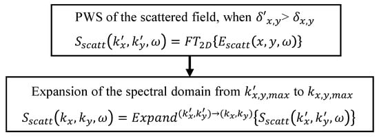 The step corresponding to the expansion of the PWS of the scattered field is shown in Figure 3, and it is denoted by . This step is conducted right after the 2D Fourier transform of the scattered field from () to ().