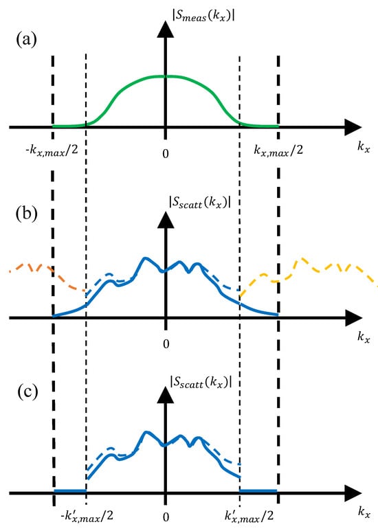 If the scattered field is sampled with a coarser sampling rate, , then , as depicted in Figure 1b, resulting in a loss of spatial resolution in the imaging domain, aside from potential aliasing issues depending on the spectral bandwidth of the scattered field. To address this, a well-known technique is to zero padding the spectral domain from to (Figure 1c) so that the resolution in the spatial domain becomes again . Nevertheless, this technique is valid when the spectral bandwidth of the scattered field is less than . Otherwise, zero padding may result in a discontinuity of the PWS which can affect the recovered microwave image. Another method to address the issue of subsampled acquisition domains was presented in [25] for multistatic imaging systems. This method is based on the replication of the PWS beyond (which results in the same spectrum as shown in Figure 1b); then, a weighting function is applied to filter these replicas out.