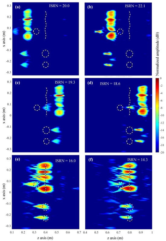 Microwave imaging results of the simulation-based example of Section 3. The acquisition domain is located at z = 0 m. (a) DAS algorithm, targets 40 cm away from the acquisition domain. (b) DAS algorithm, targets 80 cm away. (c) Conventional Fourier-based imaging algorithm, targets 40 cm away. (d) Fourier-based imaging algorithm, targets 80 cm away. (e) Modified Fourier-based imaging algorithm considering the field radiated by the OEWG antenna, targets 40 cm away. (f) Modified Fourier-based imaging algorithm considering the field radiated by the OEWG antenna, targets 80 cm away. The white dashed lines indicate the profile of the four metallic targets.