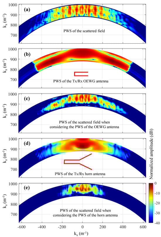 The PWS of the acquired scattered field and the OEWG antenna are depicted in Figure 7a,b, respectively, together with the result of multiplying both PWS, Figure 7c. In the latter plot, the tapering effect in the PWS of the scattered field introduced by the PWS of the OEWG can be observed.