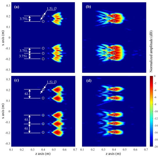In this subsection, the resolution achieved with conventional and modified Fourier-based imaging algorithms will be tested by considering small circular metallic targets with different spacing, depicted in Figure 8a,c. This analysis will be conducted for the case where the targets are 40 cm away from the acquisition domain, as shown in Figure 6c,e; this is the case where the introduction of the field radiated by the Tx/Rx antenna improves the imaging results with respect to conventional Fourier-based imaging.
