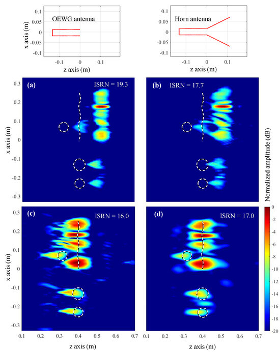 Imaging results when the simulated scattered field is acquired using the OEWG antenna and the horn antenna are depicted in Figure 9. Fourier-based imaging algorithm without and with considering the field radiated by the Tx/Rx antenna are compared as well. It can be observed that, regardless of the kind of antenna used in the acquisition of the scattered field, the major improvement happens when the field radiated by the Tx/Rx antenna is incorporated into the imaging algorithm (Figure 9c,d). Concerning the influence of the kind of antenna, it is noticed that reflectivity images retrieved from the scattered field acquired with the horn antenna (Figure 9b,d) are smoother than those obtained from the scattered field acquired with the OEWG (Figure 9a,c). This is consistent with the explanation given in the previous paragraph.