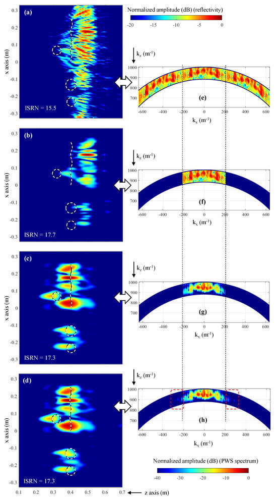 Finally, the PWS depicted in Figure 10e is also multiplied by the PWS of the aperture field of the horn antenna (Figure 7d), resulting in the PWS plotted in Figure 10h. It can be observed that the resulting PWS has almost the same spectral bandwidth as the PWS horn antenna, which is consistent with the fact that the spectral bandwidth of the horn antenna is approximately . Thus, the replicas of the PWS of the scattered field outside the - interval are attenuated (highlighted with dashed red lines in Figure 10h). The recovered reflectivity is shown in Figure 10d, being almost identical to the one recovered with the modified Fourier-based imaging when zero padding is conducted in the spectral domain.