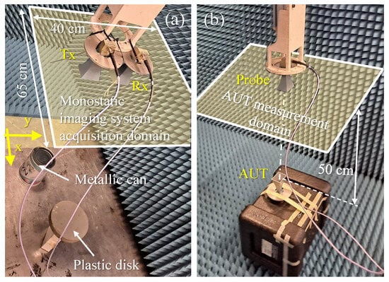 Validation with measurements has been carried out using the facility described in [33]. Figure 11a shows the monostatic microwave imaging setup in the 12–18 GHz frequency band. Two targets were considered: an 18 cm long × 14 cm ⌀ metallic can, and an 18 cm ⌀ and 4 cm thick plastic disk, placed 22 cm above the metallic floor of the facility. The size of the scattered field acquisition domain was = 65 cm × 40 cm, discretized every = 10 mm ( at the center frequency of 15 GHz), and placed 1 m above the floor of the measurement facility. The Tx and Rx antennas were two horn antennas [34] connected to a Vector Network Analyzer (VNA) using 2 m long cables. To remove the additional phase shift introduced by these cables, the measurement setup was calibrated at the connection between the antennas and the cables using a mechanical Open-Short-Load-Through (OSLT) calibration kit.